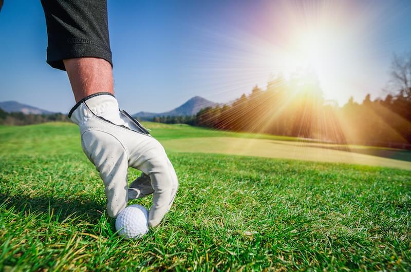 Hand with a glove is placing a t golf ball on the ground. Golf course with green grass with mountains in the background. Soft focus or shallow depth of field. Sunshine in the background