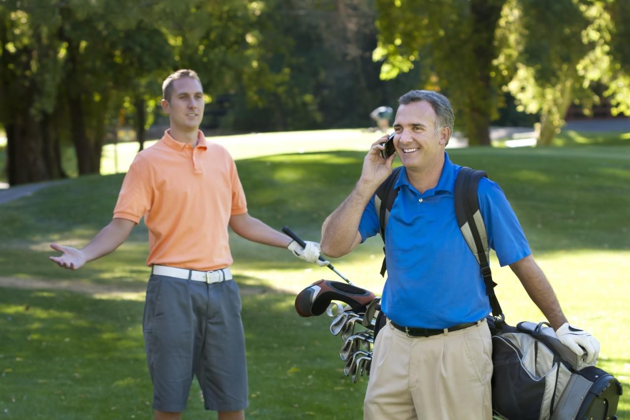 Get off Your Cell Phone and Play ● December 2, 2015 by Ship Sticks Next A golfer takes a cell phone call while his fellow golfer asks him to get off his phone and just play